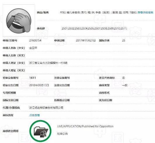 沒(méi)錯,就是這位名叫金召平的人,早在2017年的時(shí)候就提交了「捂臉」商標申請,并且目前已經(jīng)發(fā)了商標初步審定公告了。