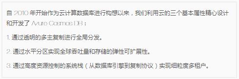 Cosmos DB 提供了一個(gè) NoSQL 數據庫服務(wù),類(lèi)似于 AWS DynamoDB 和 Google Cloud Datastore。此外,Cosmos DB 是 Azure 的基礎服務(wù),這意味著(zhù)它可以在所有 Azure 區域中使用,包括政府、主權國家和美國國防部等方面的專(zhuān)有云。根據 Azure Cosmos DB 創(chuàng )始人和微軟技術(shù)研究員 Dharma Shukla 的說(shuō)法,Cosmos DB 是作為云原生數據庫服務(wù)而創(chuàng )建的,具有三個(gè)基本特征。