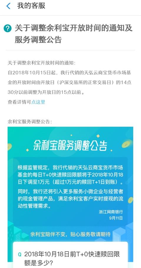 另外需要注意的是,根據余利寶之前公告,從 2018 年 10 月 18 日開(kāi)始,個(gè)人用戶(hù)每日T+0(即交易日當日)快速贖回金額將從目前的 100 萬(wàn)元下調到 1 萬(wàn)元。屆時(shí),超過(guò) 1 萬(wàn)元的贖回將在T+1 日(即下一個(gè)交易日)到賬。
