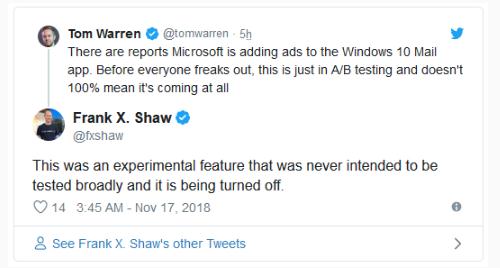 在用戶(hù)憤怒地遞交報告之后,微軟今天證實(shí)該公司僅在有限數量的設備上測試了廣告,并且正在關(guān)閉。