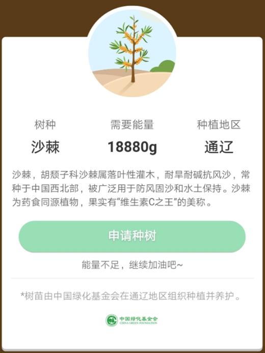 今日,螞蟻森林上線(xiàn)了新樹(shù)種——沙棘,號稱(chēng)“首款可以吃的螞蟻森林”,需要能量 18880g。