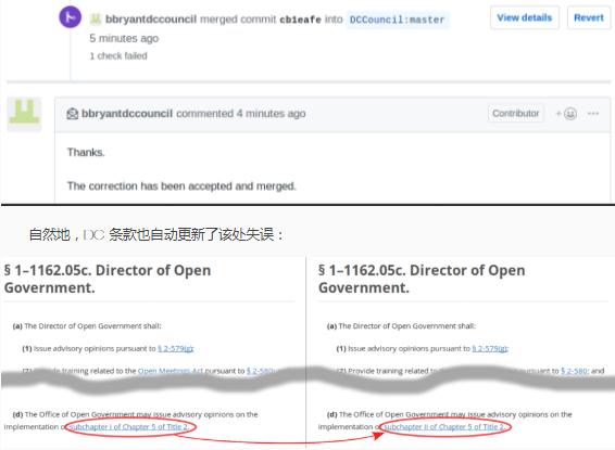 其中,“subchapter I” 應為 “subchapter II”,于是 Joshua 提了一個(gè) PR 更正該錯誤。幾天后,委員會(huì )的編纂律師將其合并: