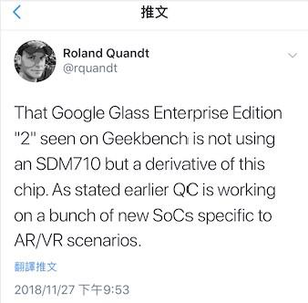 昨日晚間,Roland Quandt 在社交媒體上透露,在 GeekBench 跑分測試中現身的第二代企業(yè)版谷歌眼鏡的產(chǎn)品上,所使用的并非驍龍 710 芯片,而是一款高通專(zhuān)門(mén)針對 AR/VR 場(chǎng)景而設計的芯片。