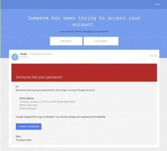 出現在每個(gè)項目中都是這種嘗試的跡象,但如果用戶(hù)不仔細觀(guān)察它們很容易被遺漏。在回答問(wèn)題后,用戶(hù)會(huì )看到解釋合法的郵件及網(wǎng)絡(luò )釣魚(yú)的例子,所以如果用戶(hù)在看到釣魚(yú)鏈接時(shí)不知道如何發(fā)現,這可能是學(xué)習的好方法。
