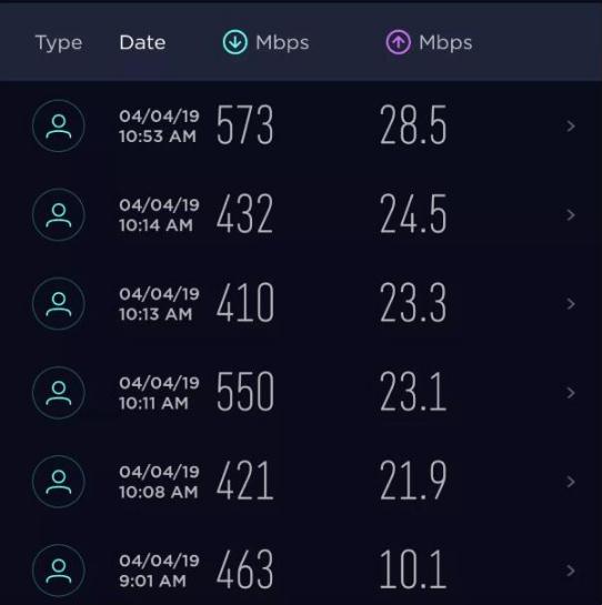 Welch 用的是摩托羅拉的 5G 手機 Moto Mod。他說(shuō),在有 5G 信號的地方,數據速度比 Verizon 的 4G LTE 網(wǎng)絡(luò )快得多,平均在 400 到接近 600Mbps,幾乎是他的 iPhone XS Max 手機的十倍。但上傳速度比預計的慢,有些摩托羅拉員工告訴他,他們自己測試時(shí)還曾經(jīng)低到接近 60Mbps。以下是 Welch 展示的測試網(wǎng)速圖。
