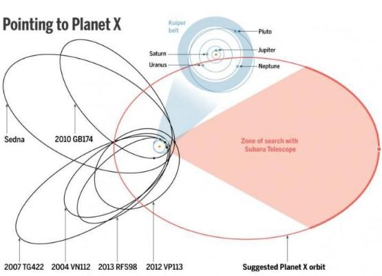 隨后,天文學(xué)家又發(fā)現大量類(lèi)似于賽德娜的小行星都具有很大的軌道傾角(幾乎與地球公轉軌道面成 50 度)。于是天文學(xué)家猜測,在海王星外的柯伊伯帶,應該有一個(gè)質(zhì)量比較大的天體將賽德娜等小行星拖到了高軌道夾角的位置。