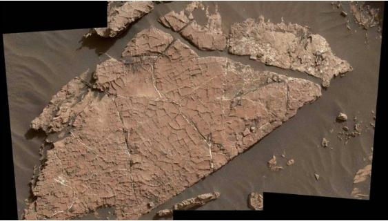 該圖像從左到右跨度約為 4 英尺,是由“好奇號”火星探測器手臂上的火星手鏡頭成像器(MAHLI)相機拍攝的三幅圖像組合。巖石表面干燥的裂縫被認為是干燥間隔打斷濕潤時(shí)期的證據,而在濕潤時(shí)期,蓋爾火山口地區有鹽水湖泊存在。