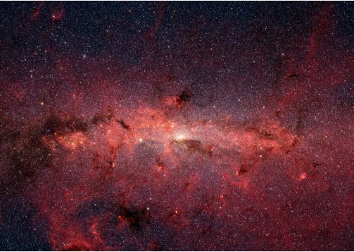 銀河系中央被塵埃和氣體云掩蓋,這讓很多探測器無(wú)法透過(guò)這些物質(zhì)看到銀河系中央的具體情況。斯皮策太空望遠鏡上的紅外相機可以穿過(guò)這些氣體云和塵埃,觀(guān)測到銀河系中心。