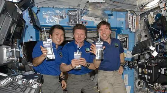 國際空間站宇航員正在快樂(lè )的引用由尿液凈化得到的純凈水。