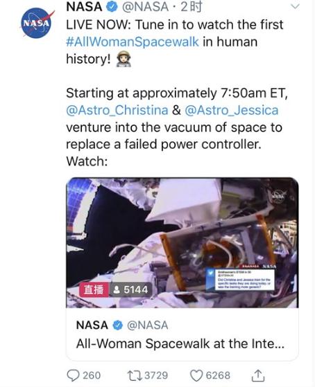 美國國家航空航天局(NASA)在 Twitter 上宣布,實(shí)現了首次全女性宇航員太空行走。本次太空行走由女性宇航員杰西卡·梅爾和女性宇航員克里斯蒂娜·科赫完成,她們的任務(wù)是修復空間站電池充電器故障。
