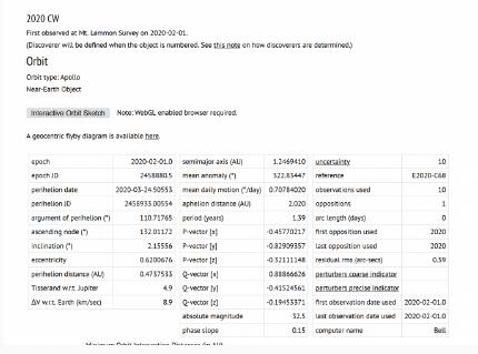 在NASA的近地物體近距離數據庫中,2020CW在距離地球最近的小行星排名中排第八。去年的萬(wàn)圣節那天,有一次更近距離的飛掠,目前在數據庫中排名第二。美國國家航空航天局(NASA)在其噴氣推進(jìn)實(shí)驗室(JPL)網(wǎng)站上表示,近地天體是被附近行星的引力推入軌道的彗星和小行星,它們可以進(jìn)入地球的鄰近區域。