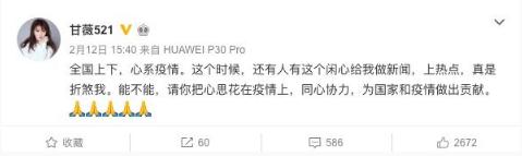 對此,甘薇也在微博上回應稱(chēng),全國上下,心系疫情。這個(gè)時(shí)候,還有人有這個(gè)閑心給我做新聞,上熱點(diǎn),真是折煞我。能不能,請你把心思花在疫情上,同心協(xié)力,為國家和疫情做出貢獻。