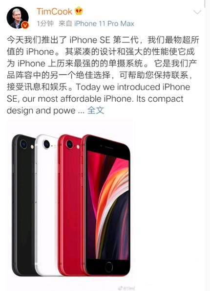對于新款 iPhone SE 的發(fā)布,蘋(píng)果 CEO 庫克也是第一時(shí)間在微博上發(fā)聲,其表示,這是目前他們最超值的 iPhone,這言外之意就是讓果粉愉快買(mǎi)買(mǎi)買(mǎi)啊。