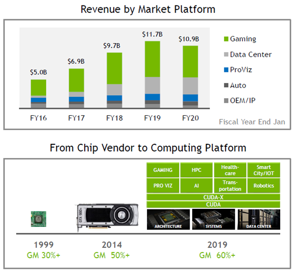 此外,NVIDIA還公布了GM毛利率這個(gè)指標,1999年的時(shí)候NVIDIA的毛利率只有30%+,在半導體公司中并不算高,到了2014年就提升到了50%,2019年又進(jìn)一步提升到了60%+,20年來(lái)翻了一倍。