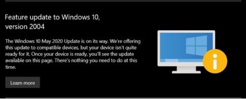 據最新消息顯示,微軟已面向主流用戶(hù)推送 Windows 10 May 2020(20H1/Version 2004)功能更新,用戶(hù)也可以手動(dòng)檢查更新。自 5 月 29 日開(kāi)始,微軟向那些無(wú)法升級新系統的用戶(hù)發(fā)送通知,表示由于用戶(hù)設備還沒(méi)有準備好所以無(wú)法進(jìn)行升級。