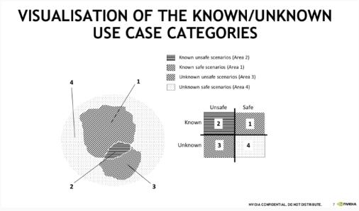 最需要關(guān)注的是區域3,即未知的不安全場(chǎng)景,由于該場(chǎng)景中存在著(zhù)巨大的風(fēng)險,如果我們對其一直處于無(wú)法悉知的狀態(tài),我們就無(wú)法評估其中的風(fēng)險會(huì )對無(wú)人駕駛帶來(lái)多大的影響。