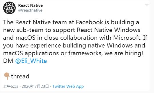 昨日,Facebook 宣布與微軟達成了更進(jìn)一步的合作,通過(guò)創(chuàng )建一個(gè)新的子團隊,來(lái)改善 Windows 和 macOS 上的 React Native 體驗。