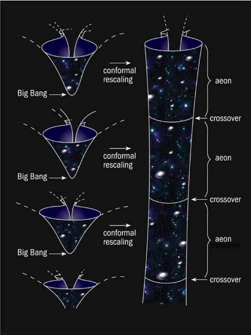 他將這個(gè)理論稱(chēng)之為“共形循環(huán)宇宙學(xué)”(Conformal Cyclic Cosmology,簡(jiǎn)稱(chēng) CCC),從大爆炸開(kāi)始的宇宙終結于一個(gè)加速膨脹的時(shí)空,形成一個(gè)世代;每個(gè)世代的終結是下一個(gè)世代的大爆炸的開(kāi)始……換句話(huà)說(shuō),CCC 描繪了一個(gè)無(wú)限的宇宙循環(huán)。