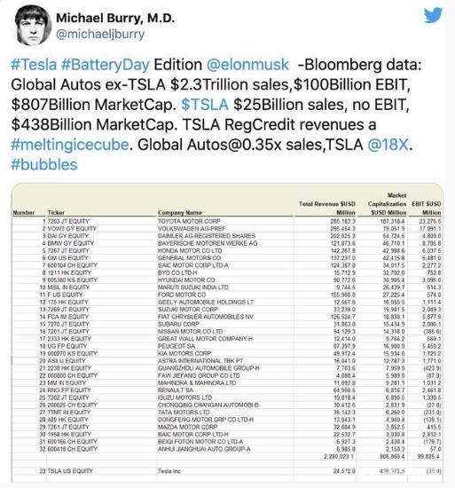 12 月 2 日消息,《大空頭》原型 Micheal Burry 今日在社交平臺上發(fā)布推文并@特斯拉 CEO 馬斯克(Elon Musk),表示自己正在做空特斯拉(TSLA.US)。此前,Micheal Burry 認為特斯拉的估值與業(yè)內其他公司相比是荒謬的,他發(fā)布了一張截圖,顯示了特斯拉與其競爭對手的估值。