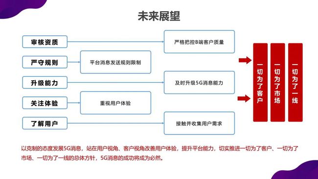 展望 5G 消息下一步發(fā)展,李野認為,運營(yíng)商應以克制的態(tài)度發(fā)展 5G 消息,站在用戶(hù)視角、客戶(hù)視角改善用戶(hù)體驗,提升平臺能力,切實(shí)推進(jìn)一切為了客戶(hù)、一切為了市場(chǎng)、一切為了一線(xiàn)的總體方針,5G 消息的成功將成為必然。