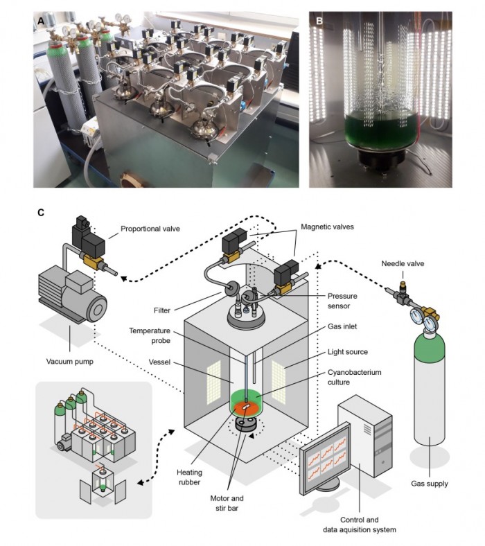 為了克服這個(gè)問(wèn)題,該團隊制作了火星結合有機系統的氣氛測試儀(ATMOS)生物反應器,由 9 個(gè)一升的玻璃和鋼制容器組成,這些容器是無(wú)菌的、加熱的、壓力控制的、數字監控的。在這里面,藍藻被引入了4% 的二氧化碳和 96% 的氮氣,以及含有磷、硫和鈣等營(yíng)養物質(zhì)的人工火星攝生石的混合物中。