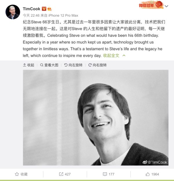 事實(shí)上,喬布斯離世后,蒂姆·庫克每年都會(huì )在 2 月 24 日發(fā)文紀念,今年自然也不例外。庫克表示,過(guò)去一年里很多因素讓大家彼此分離,而技術(shù)把我們無(wú)限地連接在一起。這是對 Steve 的人生和他留下的遺產(chǎn)的最好證明,每一天繼續激勵著(zhù)我。