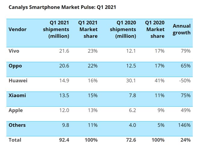 與此同時(shí),IDC和Canalys等第三方機構也發(fā)布了2021年第一季度數據。數據顯示,2021年第一季度華為跌出了全球排名前五的位置,前五名分別是三星、蘋(píng)果、小米、OPPO和vivo。