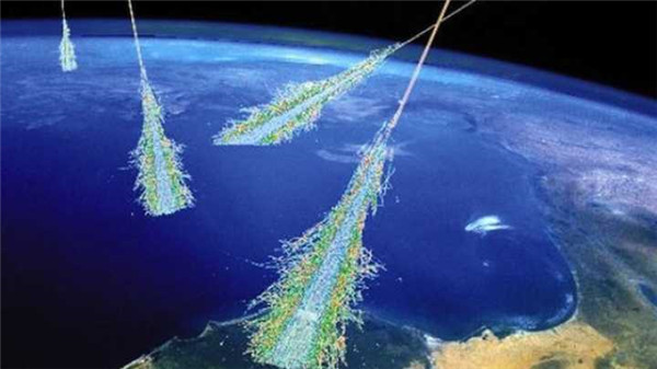 圖注:高能宇宙線(xiàn)轟擊地球大氣,產(chǎn)生的“空氣簇射”現象(示意圖)。