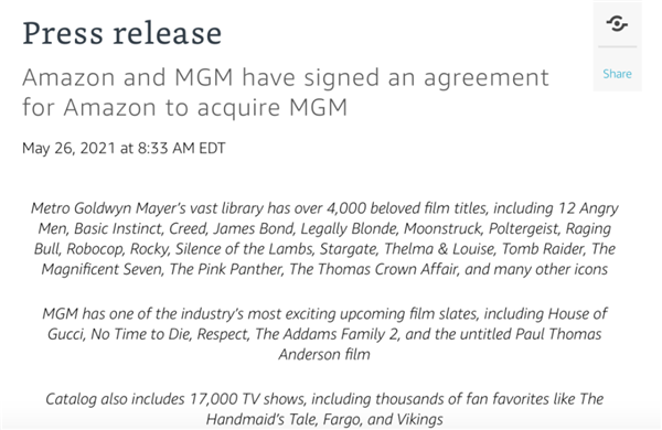 對于此次收購,亞馬遜表示,希望利用米高梅悠久的電影制作歷史以及豐富的影視資源幫助加強其電影和電視部門(mén)Amazon Studios的發(fā)展。完成收購后,米高梅多達4000部電影和1.7萬(wàn)部電視劇也將被納入亞馬遜的電影和電視部門(mén)。