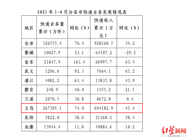 金華市郵政管理局數據顯示,今年1至4月份,義烏快遞業(yè)務(wù)量約為26.73億件,同比增長(cháng)74%,占到金華市全市快遞業(yè)務(wù)量的81.86%。但在收入方面,義烏快遞前4個(gè)月收入累計約69.42億元,同比增長(cháng)45.4%,僅占金華全市74.79%。