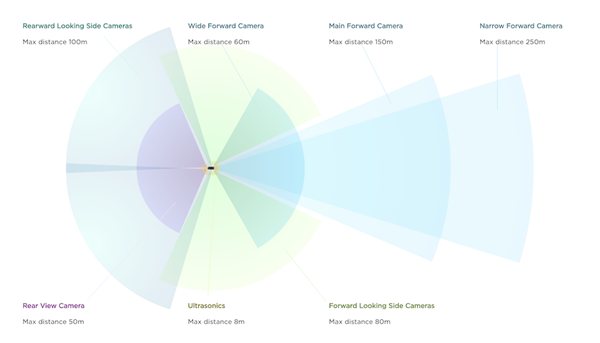 從傳感器配置上不難看出,視覺(jué)傳感器擁有比毫米波雷達更遠、更廣的探測距離,或許這是馬斯克希望取消毫米波雷達的第一個(gè)理由。