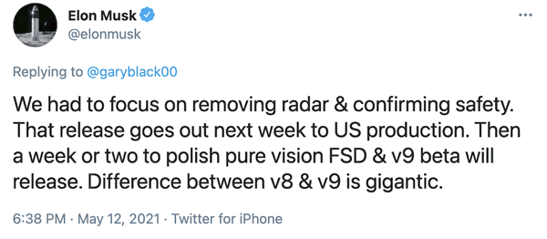 這與馬斯克社交賬號上發(fā)表的內容一致。當時(shí)他宣布,即將開(kāi)始生產(chǎn)不帶毫米波雷達的特斯拉車(chē)型。他還宣布,純視覺(jué)感知的FSD以及FSD beta也會(huì )在近期推送。