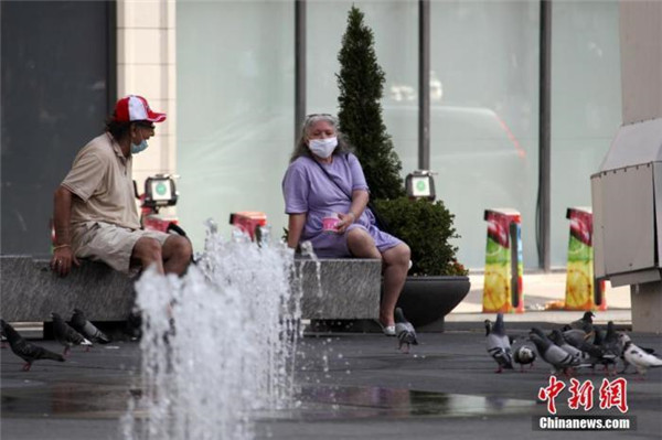 當地時(shí)間6月7日,兩位老人在加拿大多倫多市中心一陰涼處休憩。多倫多正遭遇今年首波熱浪襲擊,氣象部門(mén)已連續三天發(fā)出高溫警告。中新社記者 余瑞冬 攝