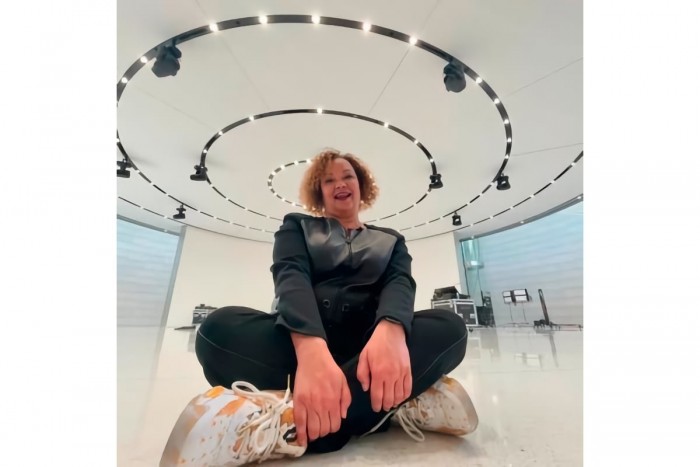 杰克遜即興拍攝的場(chǎng)景是在蘋(píng)果發(fā)布會(huì )中經(jīng)常出現的場(chǎng)景,其中包括一個(gè)天花板上有同心圓的圓形房間。白色空間里有一些輪子上的箱子,它們通常被用來(lái)裝廣播或音樂(lè )會(huì )設備,旁邊還有燈光和其他設備。