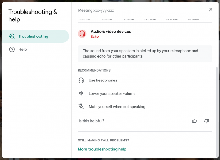 點(diǎn)擊文本通知后,用戶(hù)將被引導至 Google Meet 的幫助中心,以進(jìn)一步排查并消除導致回聲的故障點(diǎn)。