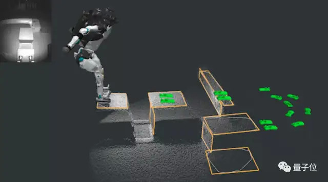 其中,Atlas會(huì )通過(guò)深度相機捕捉到紅外圖像(左上角),并從圖像數據中提取出點(diǎn)云,繪制出跑酷障礙物的表面(橙色輪廓)。