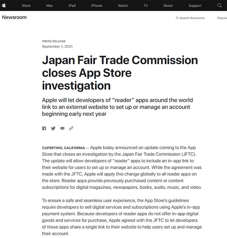 允許開(kāi)發(fā)者在 APP 外使用三方支付之后,北京時(shí)間 9 月 2 日,蘋(píng)果再度發(fā)布了一則公告,為了與日本公平貿易委員會(huì )達成調查和解,正式宣布“閱讀器”類(lèi) iOS 應用可以使用跳轉網(wǎng)站的方式,使用第三方支付,正式生效時(shí)間為 2022 年初、范圍為全球。