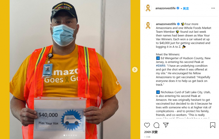 今年 8 月,亞馬遜推出了一項抽獎活動(dòng),獎勵那些接種了新冠病毒疫苗的員工,并鼓勵拒絕接種疫苗的員工接種疫苗。這些獎勵包括一輛汽車(chē),一周的帶薪假期和價(jià)值 1.2 萬(wàn)美元的度假套餐,以及 10 萬(wàn)美元和 50 萬(wàn)美元的現金獎勵。