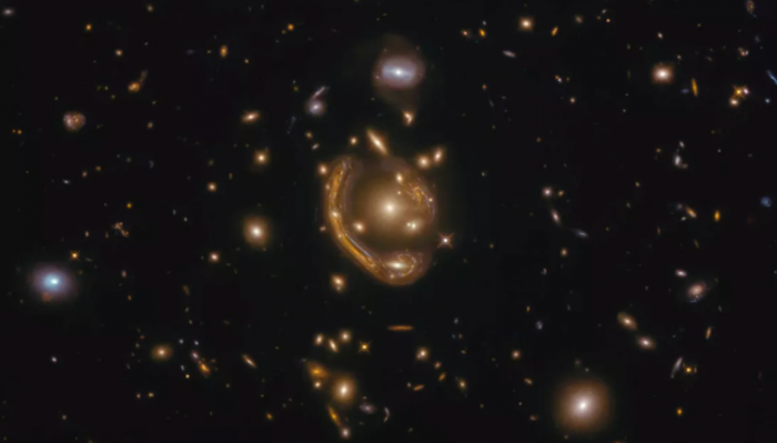 愛(ài)因斯坦環(huán)由著(zhù)名物理學(xué)家阿爾伯特·愛(ài)因斯坦首次提出,是指一種由于光源發(fā)出的光線(xiàn)受到引力透鏡效應的影響,使觀(guān)測所得的光源形狀改變呈環(huán)形的現象。在這里,來(lái)自背景星系的光線(xiàn)不僅被扭曲,而且還被放大了 20 倍。這使得天文學(xué)家能夠獲得比目前現有技術(shù)所能提供的更好的星系外觀(guān)。事實(shí)上,這種效果相當于通過(guò)一個(gè)具有 157 英尺(48 米)孔徑的望遠鏡來(lái)觀(guān)察。