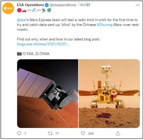 10 月 27 日,歐洲航天局空間業(yè)務(wù)中心在社交媒體上宣布,歐空局的“火星快車(chē)號”探測器與中國的“祝融號”火星車(chē)將在 11 月進(jìn)行 5 次通信測試,并向地球傳回數據。這也是歐空局十年來(lái)首次有機會(huì )在火星軌道實(shí)際測試火星快車(chē)號的數據盲收能力。