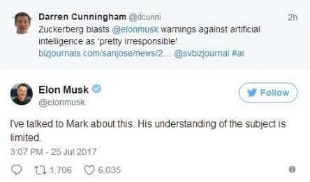 馬斯克顯然不高興,發(fā)推稱(chēng):“我和扎克聊過(guò)人工智能,他對這個(gè)領(lǐng)域的了解很有限。”意思就是,說(shuō)得好下次別說(shuō)了,你懂什么啊你?