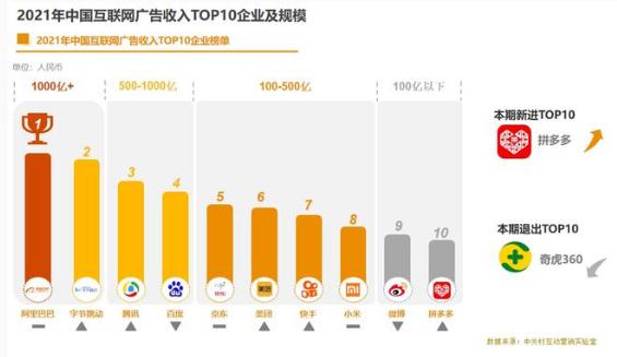 第五至第八名集中在 100 億-500 億區間內,分別為京東、美團、快手和小米四家企業(yè)。最后擠入榜單前十的是微博和拼多多,廣告收入不足 100 億元。其中,拼多多擠掉奇虎 360 進(jìn)入榜單前十。