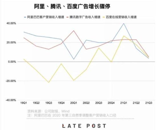 2021 第三季度財報顯示,阿里巴巴貢獻收入大頭的客戶(hù)管理(含廣告和傭金)收入同比增長(cháng)僅為3%;百度的廣告營(yíng)收再一次陷入低迷,廣告營(yíng)收同比增速僅為6%;騰訊的廣告收入增速將至了 2017 年以來(lái)的最低點(diǎn),Q3 廣告收入同比增長(cháng)5%。甚至以騰訊新聞為主要承載平臺的媒體廣告收入,開(kāi)始負增長(cháng)。