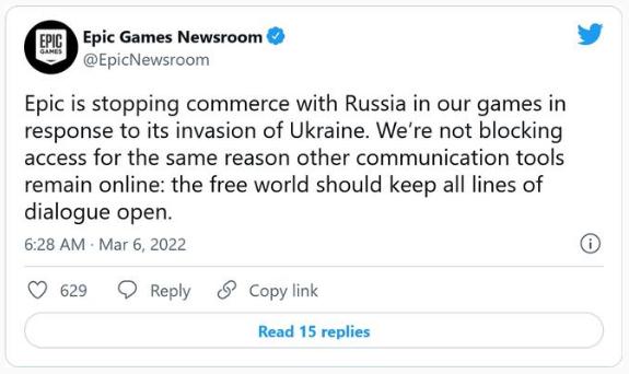在動(dòng)視暴雪宣布后不久,Epic Games 表示,它在其游戲中“停止了跟俄羅斯的商業(yè)往來(lái)”,但它指出不會(huì )禁止俄羅斯玩家訪(fǎng)問(wèn)這些游戲。目前還不清楚《堡壘之夜》開(kāi)發(fā)商的商業(yè)禁令是否適用于微交易、游戲或兩者。