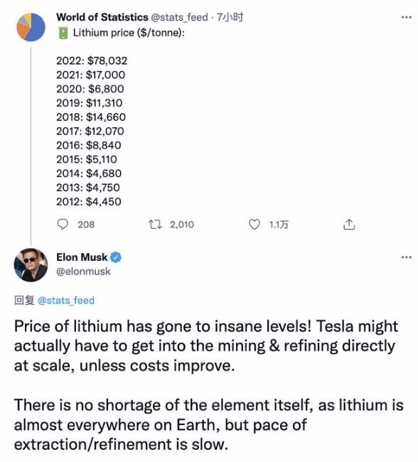 馬斯克是在回應一條推文中這樣說(shuō)的。此前一條推文展示了過(guò)去20年每噸鋰的平均價(jià)格,自2021年以來(lái)鋰價(jià)開(kāi)始大幅上漲。根據基準礦產(chǎn)情報公司(Benchmark Mineral Intelligence)的數據,去年鋰價(jià)上漲幅度超過(guò)480%。