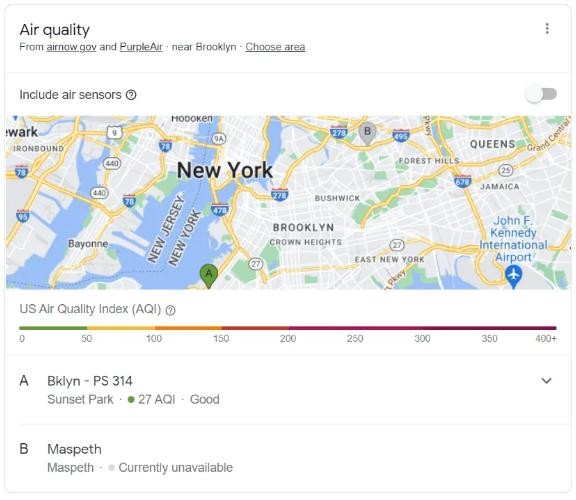 谷歌首先在印度發(fā)布了該功能(現在也可以在澳大利亞維多利亞州使用),現在正在通過(guò) airnow.gov 和 PurpleAir 的幫助將其帶到美國的搜索服務(wù)中。移動(dòng)端和桌面端網(wǎng)絡(luò )用戶(hù)可以輸入他們想查詢(xún)的美國城市,搜索會(huì )提供指定位置的信息。用戶(hù)可以輸入“波士頓的空氣質(zhì)量”或“布魯克林的空氣質(zhì)量”。例如,截至撰寫(xiě)本文時(shí),布魯克林市的 AQI 為 27,空氣質(zhì)量?jì)?yōu)良。