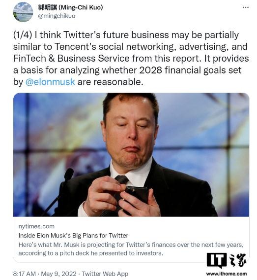 郭明錤指出,2021 年,騰訊來(lái)自社交網(wǎng)絡(luò )(包括訂閱)、廣告和金融科技及商業(yè)服務(wù)的收入分別為 176 億美元、133 億美元和 258 億美元。因此,埃隆?馬斯克(Elon Musk)為 Twitter 制定的 2028 年實(shí)現 264 億美元收入的財務(wù)目標似乎可以實(shí)現。