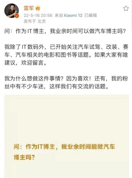 小米創(chuàng )始人、董事長(cháng)兼 CEO@雷軍在個(gè)人社交賬號發(fā)文稱(chēng),自己除了做 IT 博主之外,還準備業(yè)余時(shí)間做一個(gè)汽車(chē)博主。并稱(chēng)他目前已開(kāi)始關(guān)注汽車(chē)試駕、改裝、賽車(chē)、汽車(chē)相關(guān)的電影和圖書(shū)等話(huà)題。