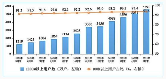 根據工信部最新數據,截至 5 月末,移動(dòng)、電信、聯(lián)通三家運營(yíng)商的的固網(wǎng)寬帶接入用戶(hù)總數已達 5.59 億戶(hù),比 2021 年底凈增 2289 萬(wàn)戶(hù)。