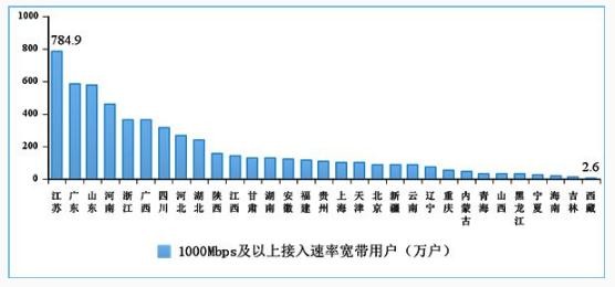 按省份劃分,江蘇已有 784.9 萬(wàn)千兆及以上寬帶用戶(hù),遙遙領(lǐng)先,廣東、江蘇都接近 600 萬(wàn),河南約 500 萬(wàn),之后是浙江、廣西、四川等。